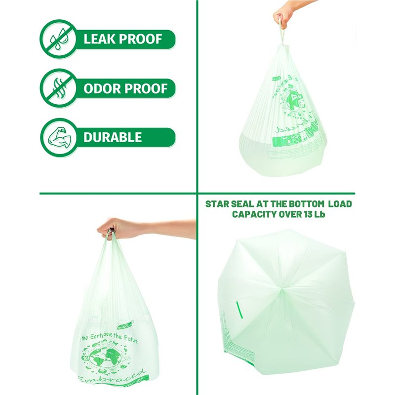 - [CONVENIENT & DURABLE] -- 100% Compostable Bags came just in a big roll and pre-set break point design help you dispense and seperate easily, handle tie and the star seal at the bottom can increase the load carrying capacity, leak-proof Compost Bin Liners does not break or tear easily in your compost containe, Note: Dispose of product within 7 days when bag is holding wet waste.