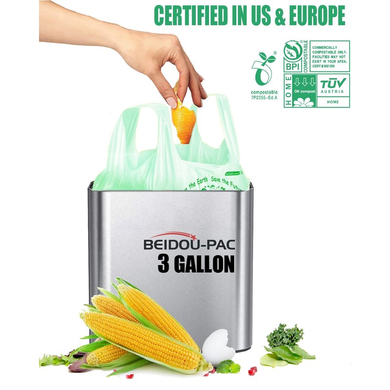 - [KITCHEN COMPOST BIN COMPATIBLE] -- BEIDOU-PAC Compostable Bags, 3 gallon (11.36 liters) 18.3" x 22" x 0.67 mils, 100 bags per roll, home compostable and biodegradable are compatible with a backyard compost system. Our compost trash bags can perfect for 3-gallon under-the-sink kitchen trash can.