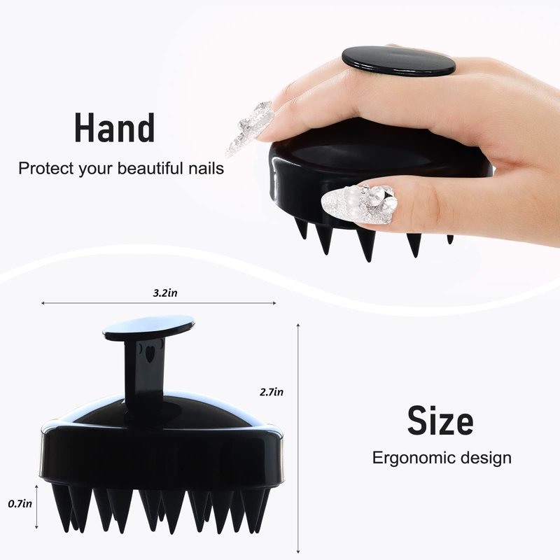 Silicone scalp massager brush. The head scrubber is exquisite and very practical, we can use it to wash the hair and massage the scalp. It plays an important role in our lives! Product name: Scalp massager brush. Material: Silicone Product Dimensions: 2.76 x 3.15 inches. Product weight: 0.11 lbs. Product color: Black. Product Quantity: 1 piece. Features: 1. Scalp scrubber is ergonomically designed to fit our palms perfectly, making it easy for us to use, and its non-slip design makes it hard to drop, allowing us to free our hands at any time. 2. The hair massager has a circular hanging, which can be threaded by itself, which is convenient for us to store. Its material is soft and durable, and we can use it for a long time. 3. The hair shampoo brush has 19 massage comb teeth, which can stimulate the acupuncture points on the head and relieve fatigue, so that we can also do SPA at home. It is the perfect gift for relatives, friends and colleagues.