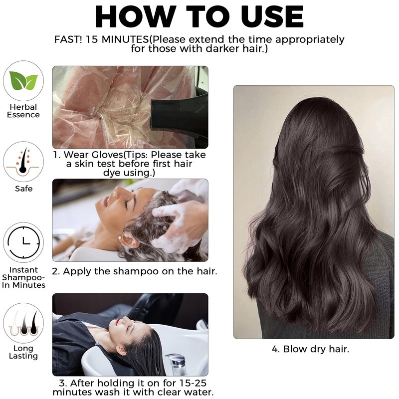 - [Use & Tips] Please skin test before first using, (1. Wear the gloves;2. apply hair dye shampoo on the hair; 3. Rub 5 Mins to color hair evenly; 4. Leave it on for 20-25 Mins(20-25 minutes for best results, Don't leave more than 30 Mins).