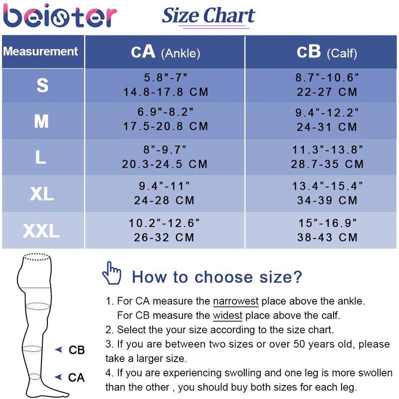 - 🌸 THERAPEUTIC EFFECT: Beister will bring you well-designed compression support socks that provides graduated compression from the ankle to upper calf. Therapeutic compression hosiery which promotes blood circulation, helps relieve tired, aching, fatigued legs. Ideal for treatment of varicose and spider veins, diabetic support, long flights and general swelling or inflammation of the legs and feet.