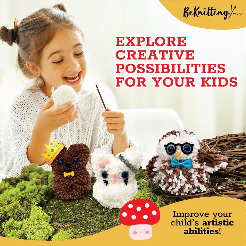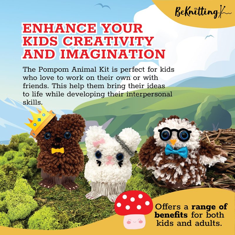 Embark on a crafting adventure with the BeKnitting PomPom Kit, filled with 31 pieces of pure crafting fun! This delightful kit will keep you and your child entertained for hours as you dive into the world of DIY furry friends. It's a wonderful and artful activity for kids 5 and over. With a colorful assortment of crafting accessories, including four balls of milk cotton yarn, three PomPom makers, and a bottle of glue, you have everything you need to bring Binky Bunny, Honey Bear, and Oscar Owl to life! As you follow the step-by-step instructions in the 20-page booklet, you'll witness the magical transformation of simple materials into adorable creatures. The kit provides all the required accessories, from pushpin eyes and sticky felt feet to pipecleaners and bowties, ensuring that your furry friends have the perfect finishing touches. From cutting, sticking, and shaping to adding personalized details, the crafting possibilities are endless!