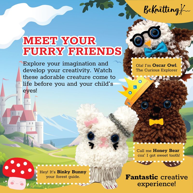 - MAKE THREE FURRY POMPOM FRIENDS - Watch as Binky Bunny, Honey Bear and Oscar Owl come to life before you and your child’s eyes! All required accessories are included and provide countless fun both while making the projects and enjoying them after.