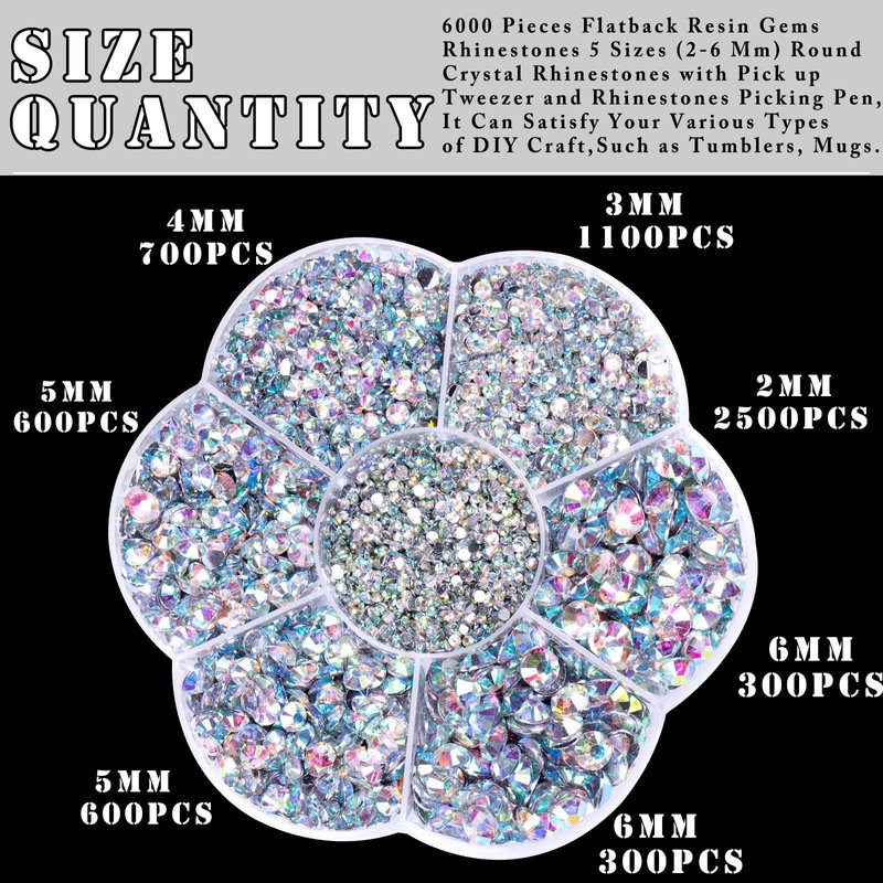 - Flatback Rhinestones for Crafts: Including 5 Size of resin flatback rhinestones totally 6000pcs, also comes with one pencils and a pickup tweezers. Flatback rhinestones kit comes with everything you needed, it's super suitable for a lot of your handmade projects!