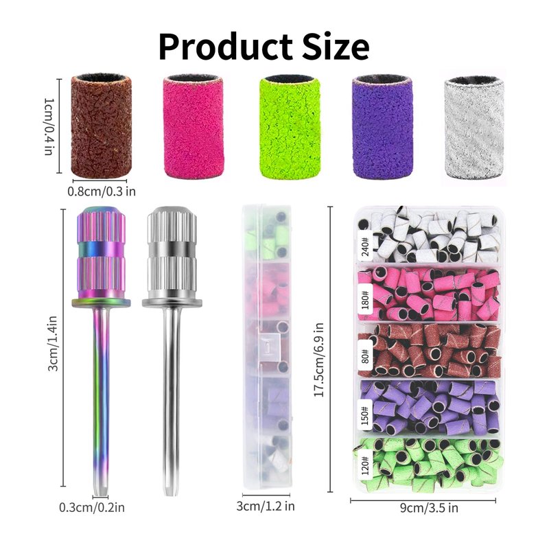- ✨【Nail Drill Sanding Bands Set】: You will receive 2 nail drill bits and 300 pieces of nail sanding bands including 60 brown coarse grit 80#, 60 green medium grit 120#, 60 purple medium grit 150#, 60 pink fine grit 180 # and 60 white very fine grit 240#. The nail drill sanding bits is suitable for most professional nail drills.