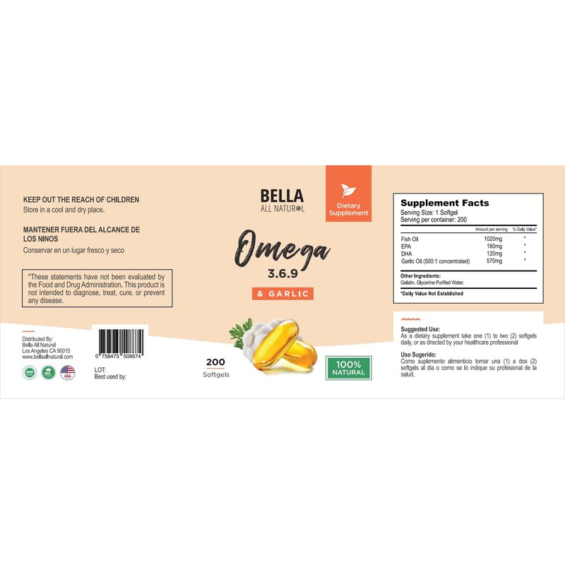 Bella All Natural Omega 3 6 9 with Garlic Oil - 200 Softgels
