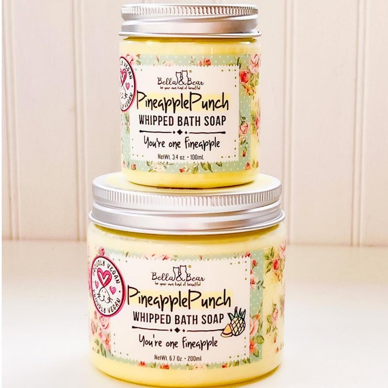 Brand New Line of Pineapple products include this fruity pineapple whipped bath soap. Can also be used as a shave cream! Vegan, No Parabens, No Phthalates, No GMOs, Food Safe Colors, Plant-Based, Recycled Plastic, Reusable Packaging, Sustainable, Gluten Free, Cruelty Free. This body wash cleanses, moisturizes and can also be used as a shave cream for women. Lather over legs and armpits and glide razor over. Also available in travel size. Bella and Bear are certified Cruelty-free and Vegan by PETA. At Bella & Bear, we don't believe in animal testing for the sake of beauty. So when you shop with us you're casting a vote for the kind of world you want to live in. All our products are 100% Vegan. Our jars come from recycled plastic and we're always looking at ways to be more socially responsible. All our products are great for gifting and make excellent gifts and stocking stuffers for women and teens for the christmas holiday
