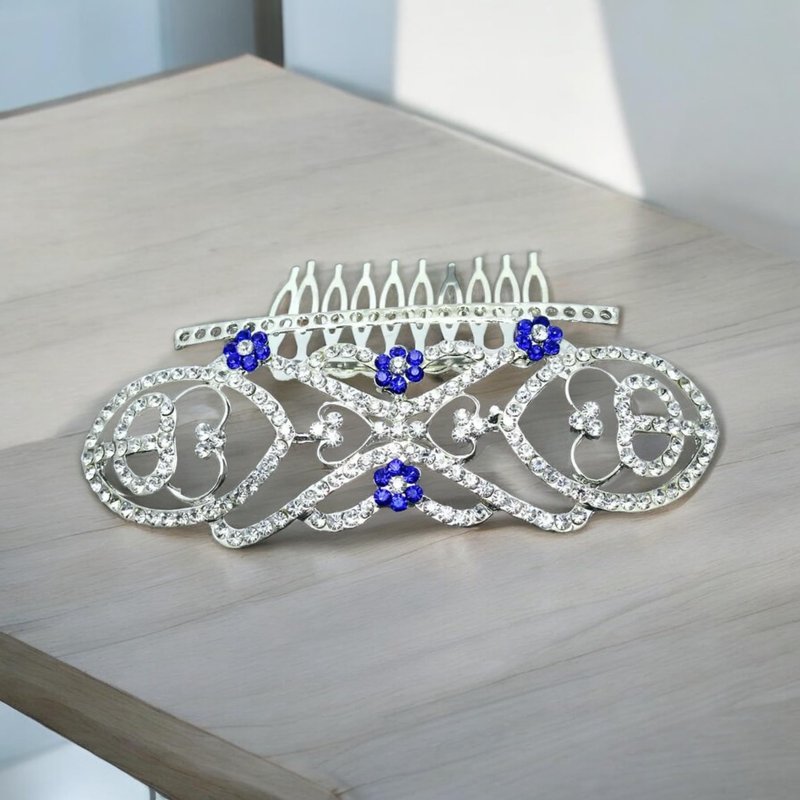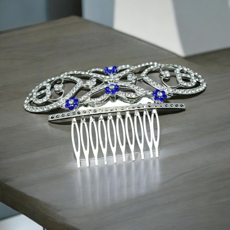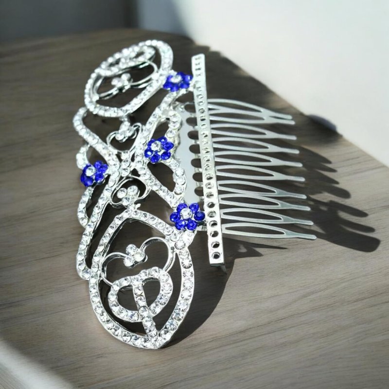 Elevate your bridal or formal ensemble with this exquisite hair accessory. Crafted with intricate detailing, this comb features a delicate floral design adorned with sparkling crystals and vibrant blue gemstones. The intricate metalwork creates a stunning, eye-catching pattern that will add a touch of glamour and sophistication to your hairstyle. With its secure comb design, this accessory ensures a comfortable and secure fit, allowing you to confidently embrace your radiant look throughout the event. This versatile piece can be styled in various ways to complement your personal style. Elevate your formal attire with this dazzling hair comb, a true statement piece that effortlessly blends elegance and beauty.
