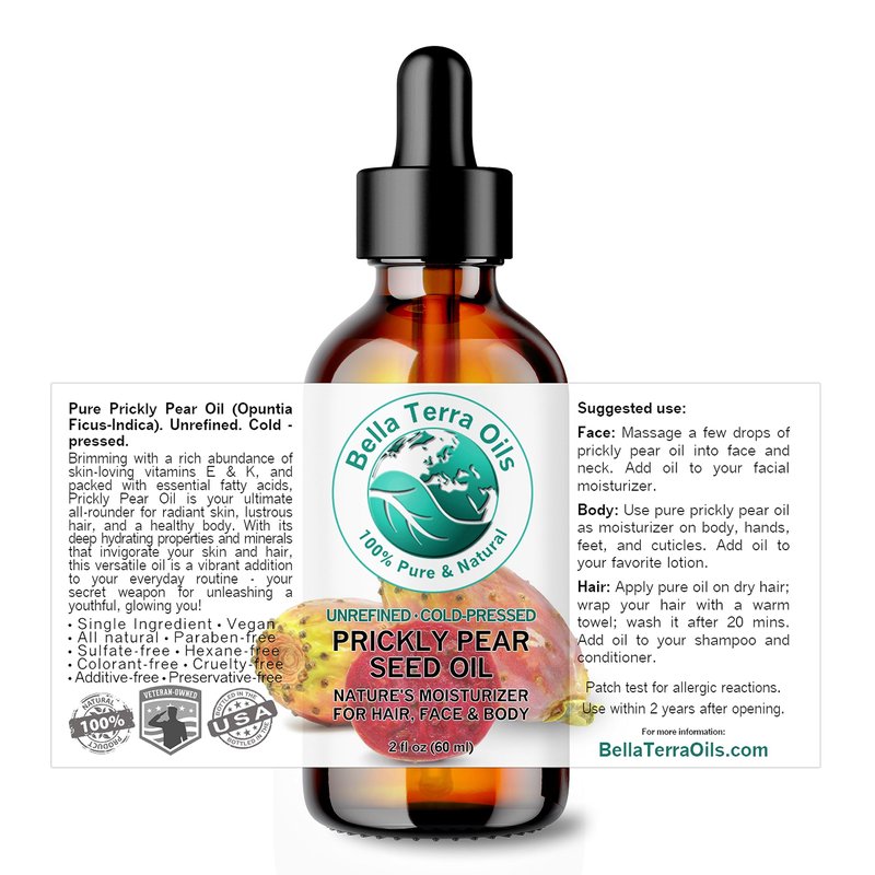 Bella Terra Oils - Prickly Pear Seed Oil 2 oz - Cold-Pressed Excellence, Packed with Vitamin E, Linoleic Acid, and Betalains, A Luxurious Touch for the Face