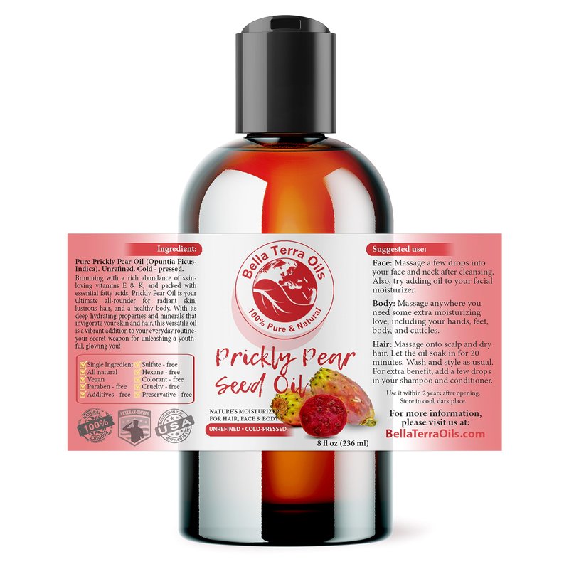 Bella Terra Oils - Prickly Pear Seed Oil 8 oz - The Symmetry of Cactus Extract & Barbary Fig, Overflowing with Vitamin B & Zinc, A Precious Skin Delight