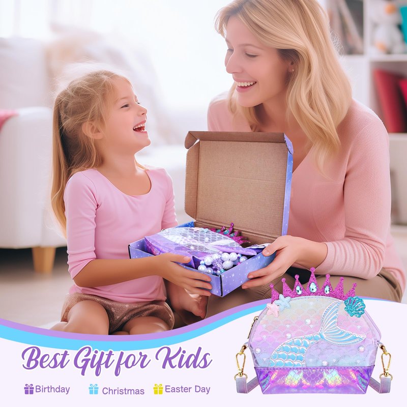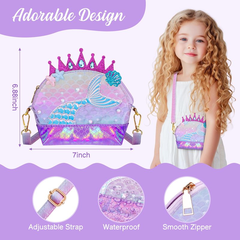 - 🌟SAFE WATERPROOF MATERIAL: The little girls purse is made of glitter PU leather and PVC, it is wear-resistant and waterproof. The included mermaid toys are made of non-toxic materials, environmentally friendly and skin-friendly.