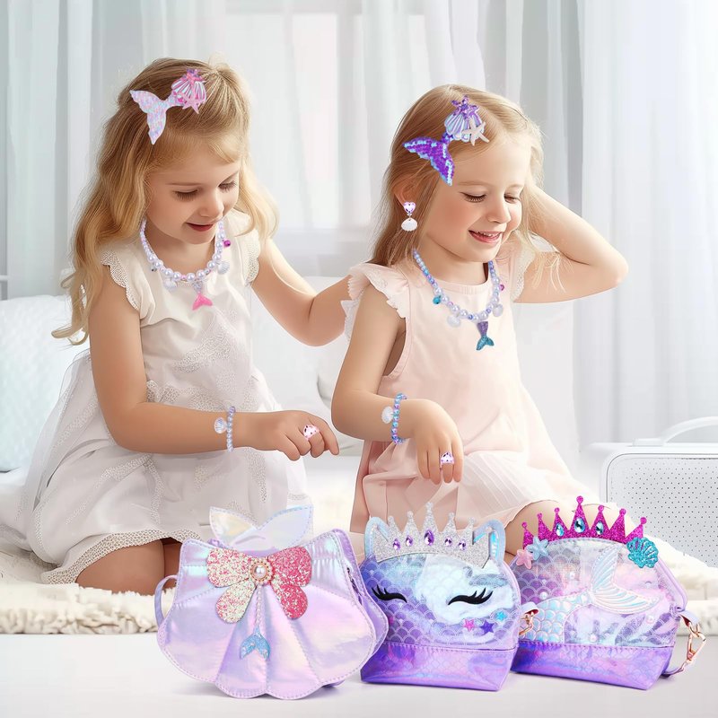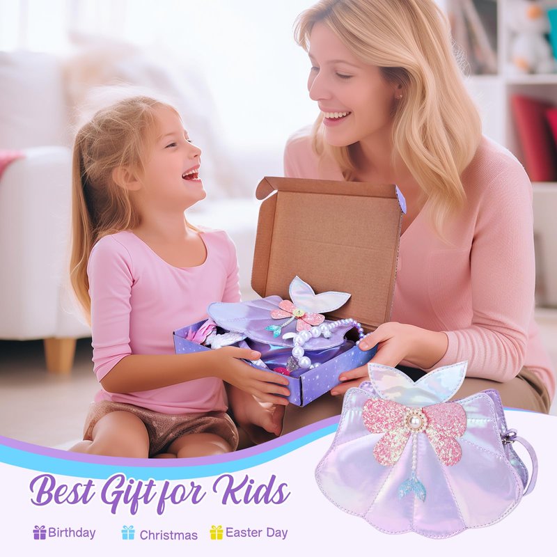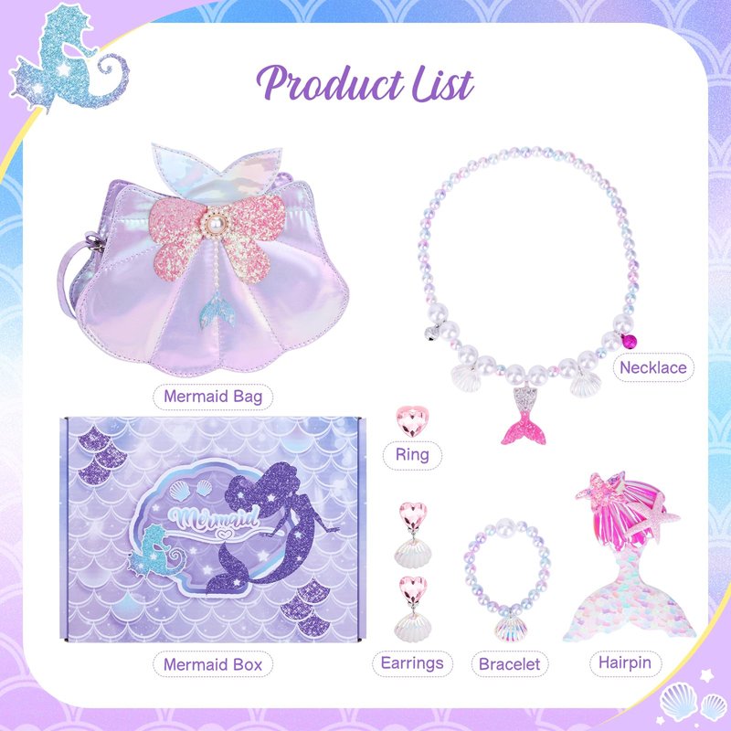 - 🧜WHAT YOUR PRINCESS WILL GET: This gift box come with shiny toddler purse and 1 mermaid jewelry set, includes 1 pair of seashell clip-on earrings, 1 heart-shaped ring, 1 mermaid hair clip, and a set of matching colorful mermaid beaded necklace and bracelet.