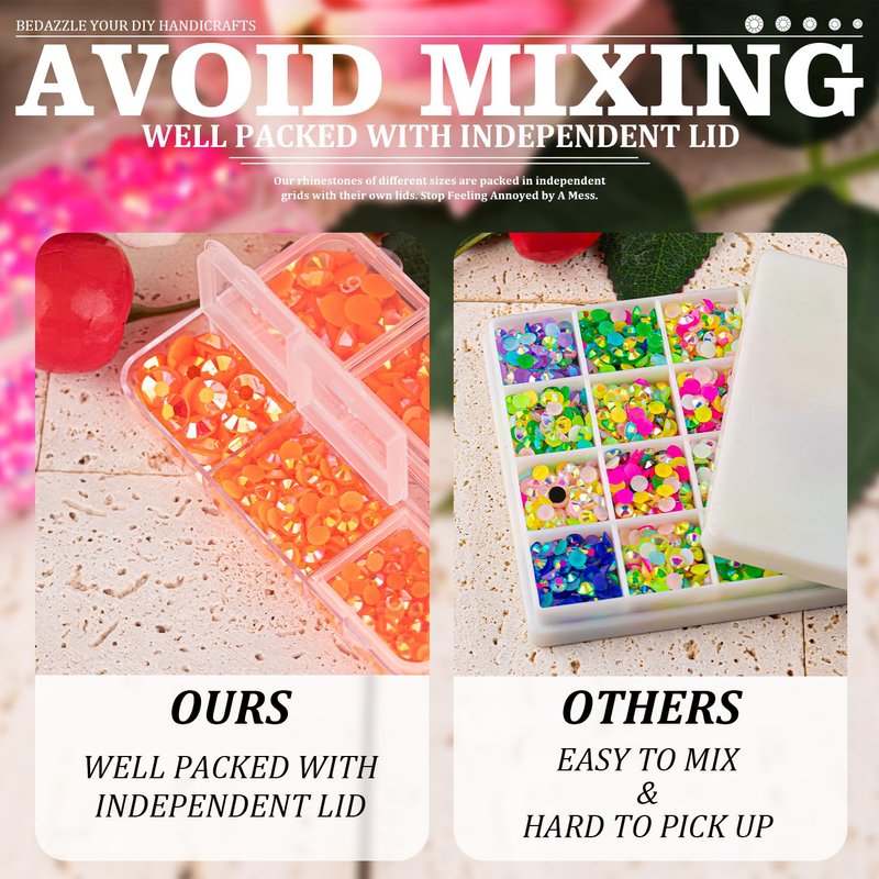💎PACKAGE CONTENT——This resin rhinestone kit includes 2 boxes, each with 6 grids, featuring a variety of sizes: Box #1 contains 2mm x 1 grid, 3mm x 1 grid, 4mm x 1 grid, 5mm x 1 grid, and 6mm x 2 grids; Box #2 contains 3mm x 2 grids, 4mm x 2 grids, and 5mm x 2 grids. A tweezer and 1 pickup pencil are included for easy picking up of rhinestones. This set offers more large-size gems, making it perfect for DIY craft decorations, eye makeup, face makeup and nail art .💎VIBRANT GEMS FOR CRAFT——Made of resin instead of glass, these rhinestones are lightweight, durable, and economical. Designed with perfect facets, these high-quality jelly gems have a delicate and exquisite shine, enhancing the appeal of your crafts or nails with their vibrant colors. The AB coating is firmly combined on the outer surface of each rhinestone, which can have different color performances under different light or different refraction angles, providing long-lasting sparkle.💎INDEPENDENT LID FOR EACH GRID——The 6-grid box features 6 individual lids, ensuring that each compartment is completely separate from the others. This design allows for easy organization of various sizes of resin rhinestones without the worry of mixing or spilling.💎TIPS FOR USE——Non-hot fix jelly flatback gemstones require adhesive for nail art, crafts, or artwork design. We recommend using B7000 rhinestone jewelry glue for DIY projects and UV / quick dry nail glue for nail art. To apply the resin rhinestones, first, clean the surface of your nails or the crafts you wish to embellish. Then, apply the rhinestones with the appropriate glue and wait for them to dry. (Please note that glue is not included.)💎WIDE APPLICATION——These sparkling iridescent resin rhinestones are perfect for creating dazzling looks. Use them for face makeup, eye makeup, body art, 3D nail art or bedazzling DIY crafts like shoes, tumblers, mugs, bottles, phone cases, popsockets, scrapbooks and more.