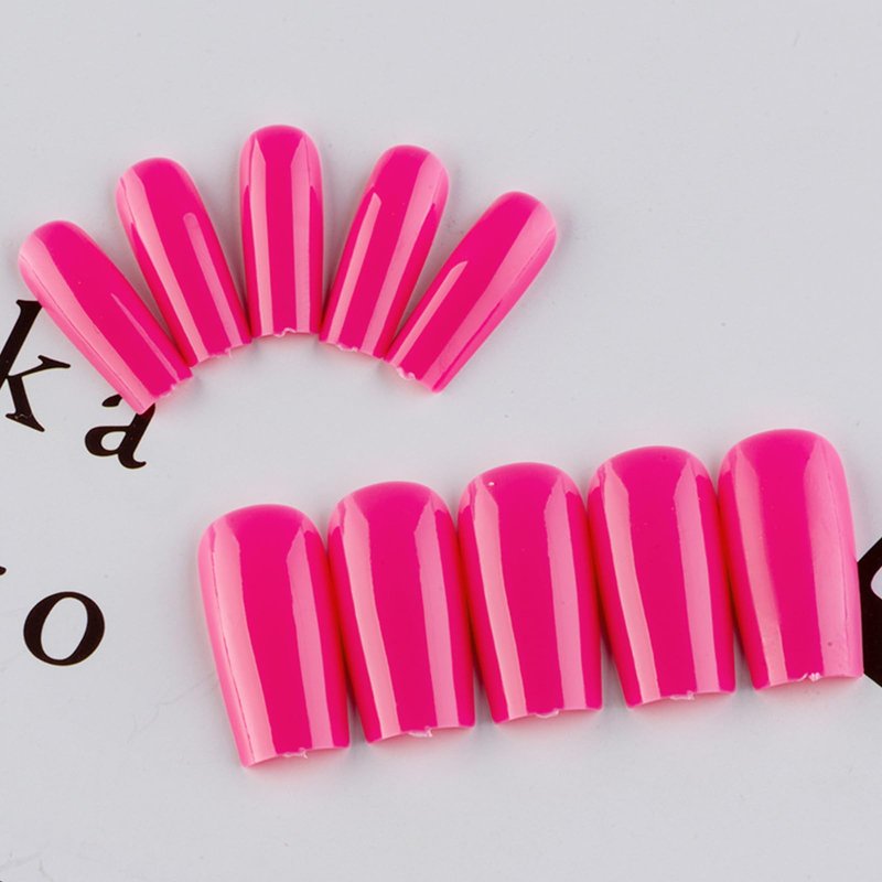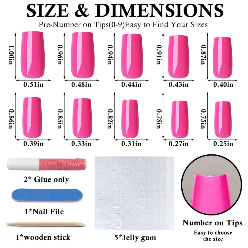 - Press on nails medium kit, come with 120pcs medium hot pink nails press ons for women girls teens diy medium square nails. 2*nail glue for get long lasting glue nails, 5 nail adhesive tabs. 1 nail file and 1 wooden stick. No need to buy additional materials, you can achieve the elegant press nail salon effect at home in minutes. Perfect for everyday trips to the beach, save your money and time.