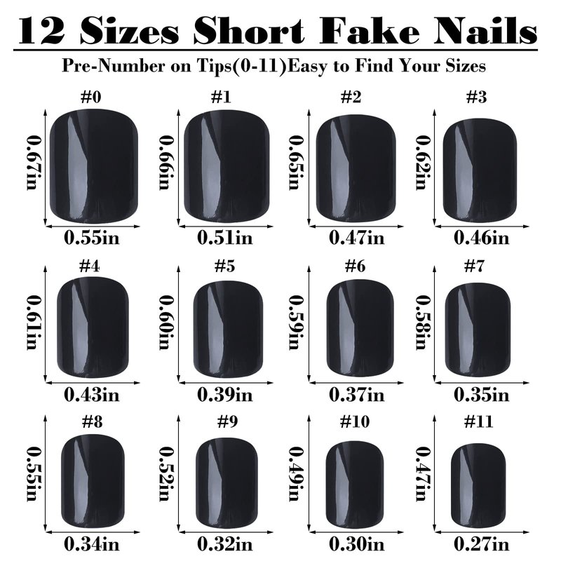 - The glossy full cover press on nails contains 12 different sizes, especially friendly for small nail beds. The fake nails are numbered inside (0-11), so even if they are mixed together you can easily find the right size for every fignernail. Convenient and quick.