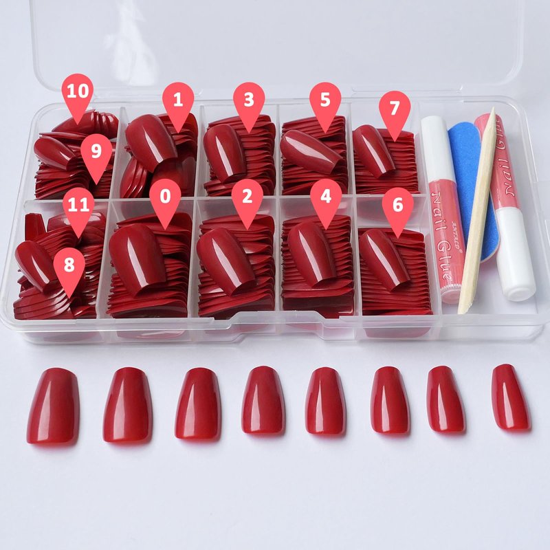 - Various sizes: the short press ons have 12 different sizes for choice, and it inside pre-numbered 0-11, so even mixed together they are easy to track and find. The different sizes ensure that they fit most people's finger nail, whether your have a small or large nail hands, flat or slight curve nail bed.