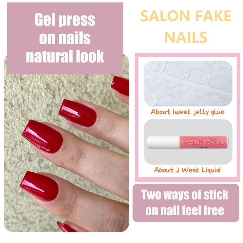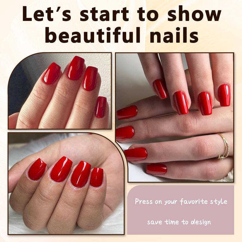 - High quality press-on nails, the coffin press on fingernails is shiny glossy nails design, classic and elegant red fake nails can make your finger nails amazing. The top of the short nails are thicker design can avoid folding, bottom has a lighter edge and slight curve can fits perfectly on your real nails. And the short glue on nails are light and soft, so they won't be a burden to our nail bed after wearing.