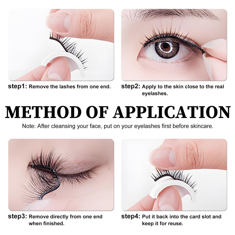 1. Remove makeup and clean your eyes before use. Do not use the self-adhesive false eyelashes after makeup to prevent the adhesion of the eyelashes from being affected