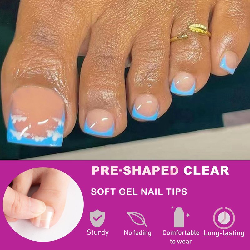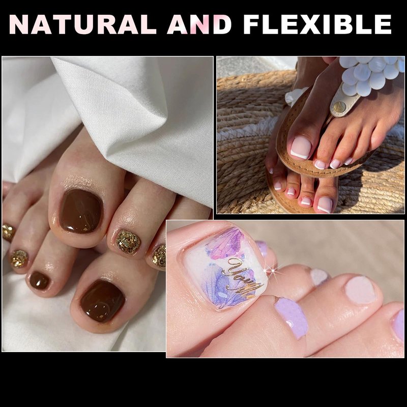 - Easy to use: our press-on nail tips have smooth edges, more shallow curve, easy to fit tightly to the nail bed, toenail acrylic nails are more breathable without uncomfortable "tightness". Short toe gel x tips are easy to paint and trim, just apply nail glue and press on the nails, cut the excess off the side of the tips with nail clippers, then decorate the nail tip with your favorite colored nail polish/decorations to make your nails cute and stylish.