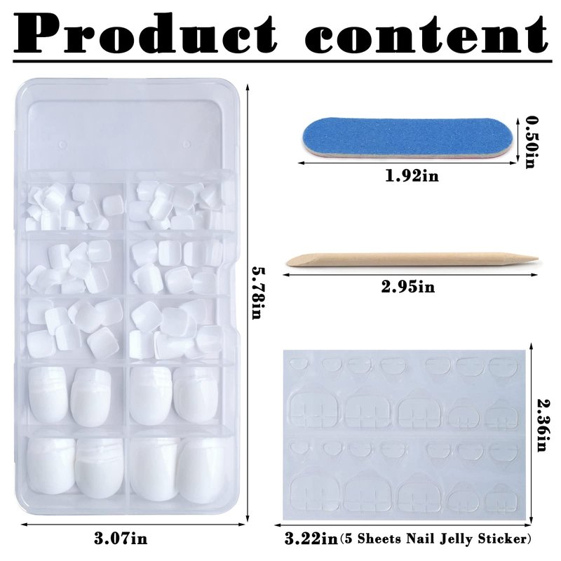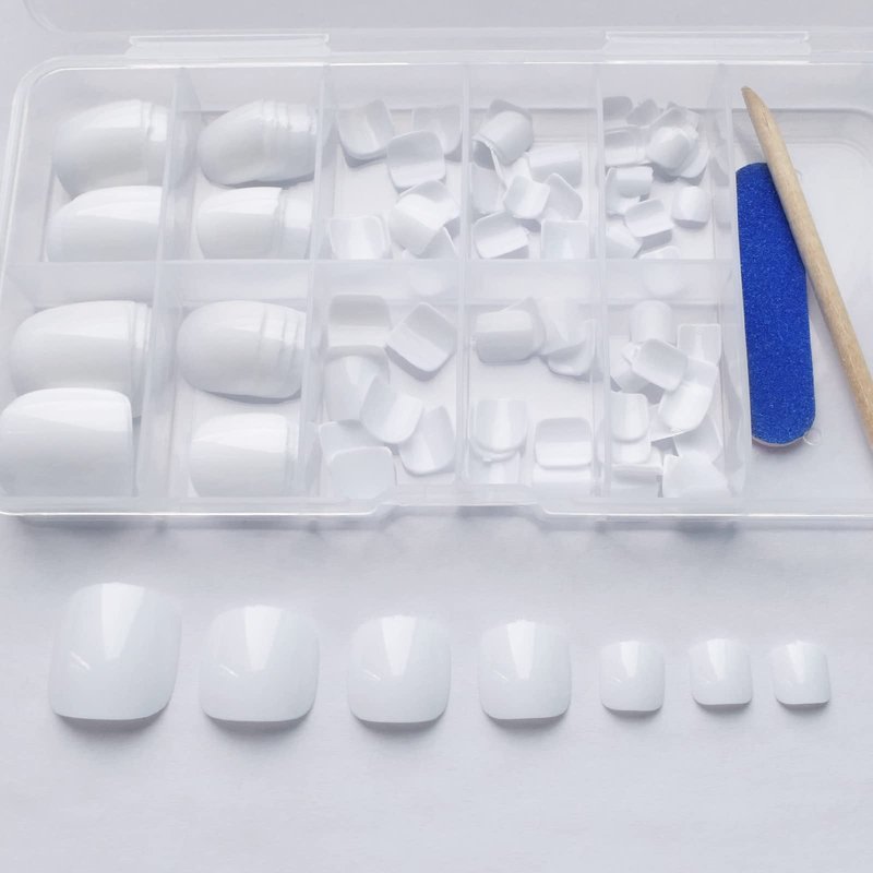 - Short press on toenails kit: contains 120pcs glossy short square press on toes nails, 5 jelly adhesive sticker, 1 nail file and 1 wooden stick. No need to buy additional materials, you can achieve DIY nail salon effect at home, saving your time and money.