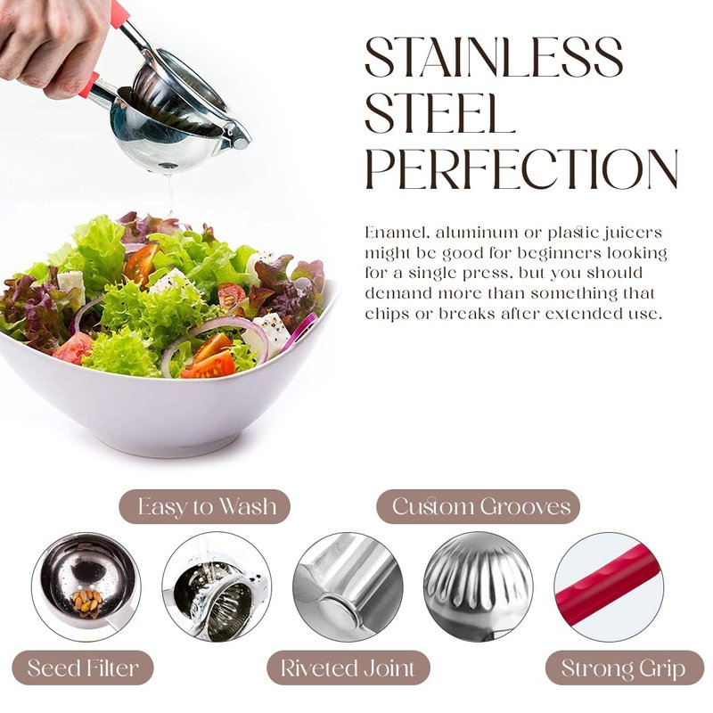 The Bellemain Stainless Steel Lemon Press is made of the same high quality alloy as eating utensils, and won't rust, scratch, pit or crack. It won't leach toxins into your food like plastic and aluminum can do. Plus, it's solid-cast for strength to give you many years of reliable use.