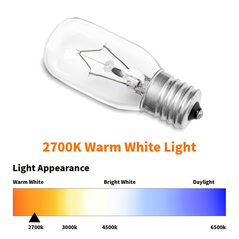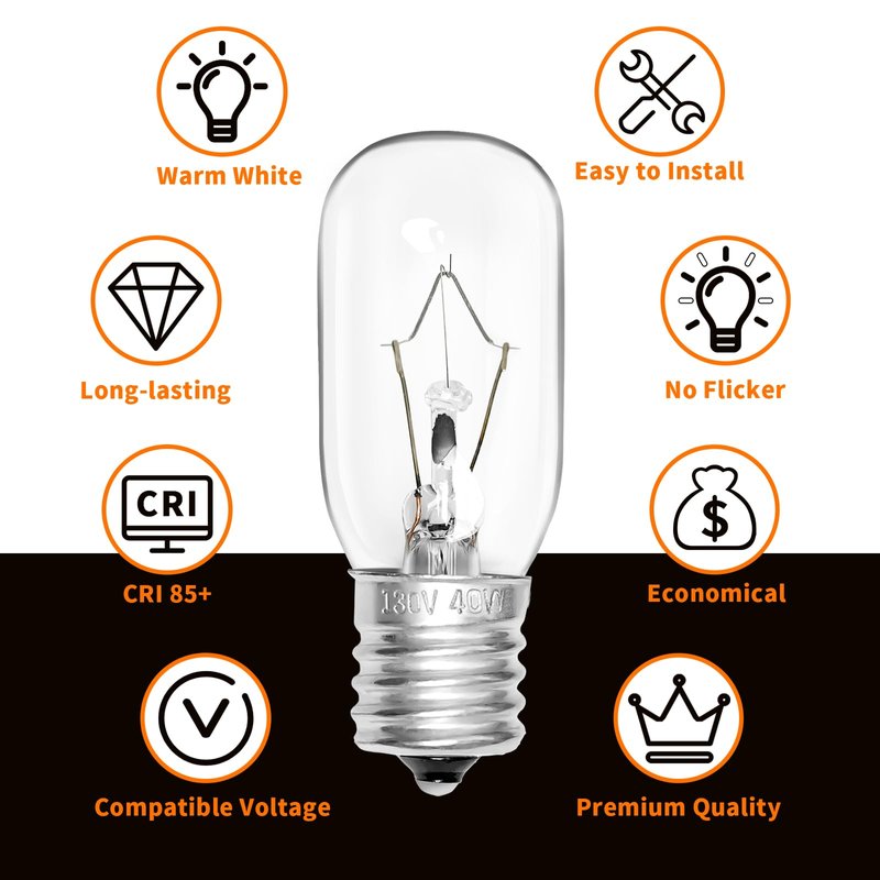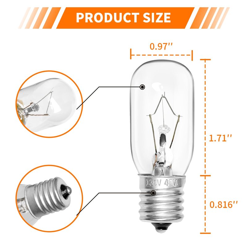 - Bulb Length: 2.5 inch tall, 1 inch wide; Wattage: 40 Watt; Working Voltage: 110V-130V; Base Socket: E17; Lumin: 360; Color Temperature: 2700K; Bulb Shape: T25 Tubular; Lifespan Up to 1500hrs.