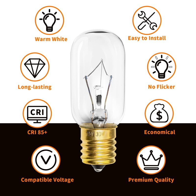 - 125V 30W E17 base, 2.6" in length, 1" in width, warm white.