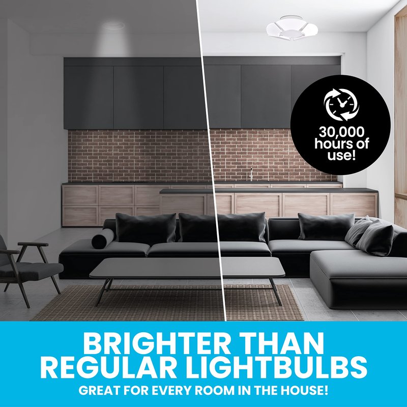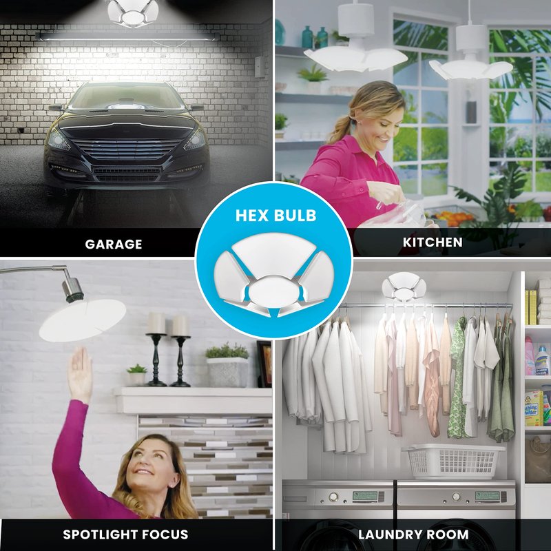The Bell+Howell Hex Bulb E26 LED Garage Light features 144 high-intensity LED bulbs delivering over 3500 lumens, transforming any area into a brilliantly lit space. With an adjustable design of six panels, five of which rotate 360 degrees, focus the light precisely where you need it. ETL Listed for safety, this 40W light fits standard sockets and requires no complex installation. Crafted for durability, each LED bulb offers approximately 30,000 hours of use. Upgrade to superior lighting today!