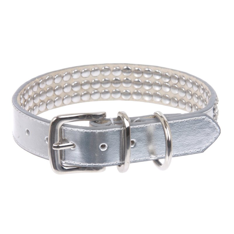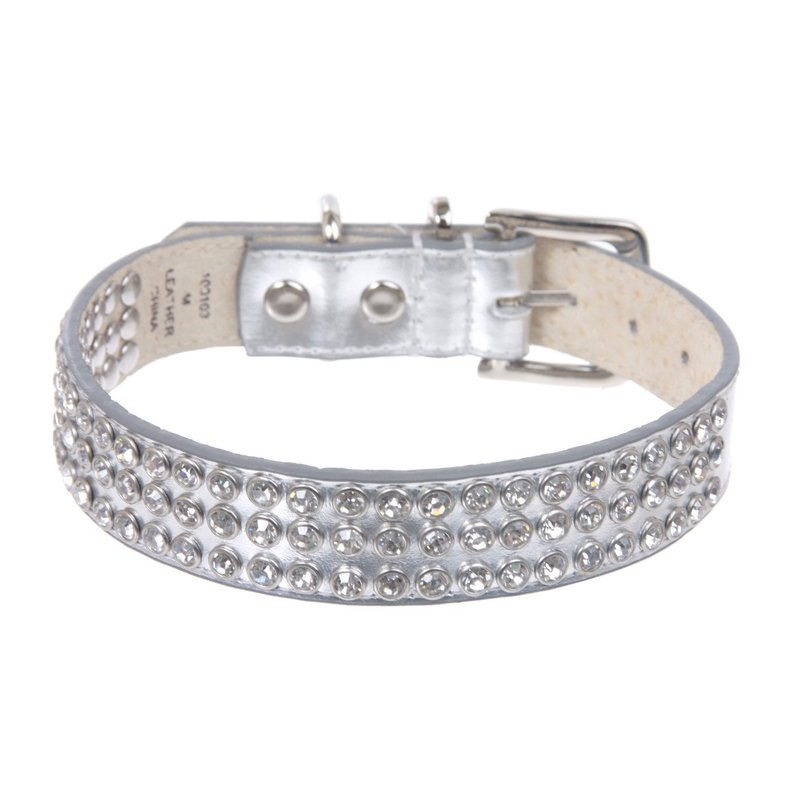 beltiscool 7/8" (22 mm) Leather Dog Collar with Clear Rhinestones Size: M: 11"-13" Neck Color: Silver