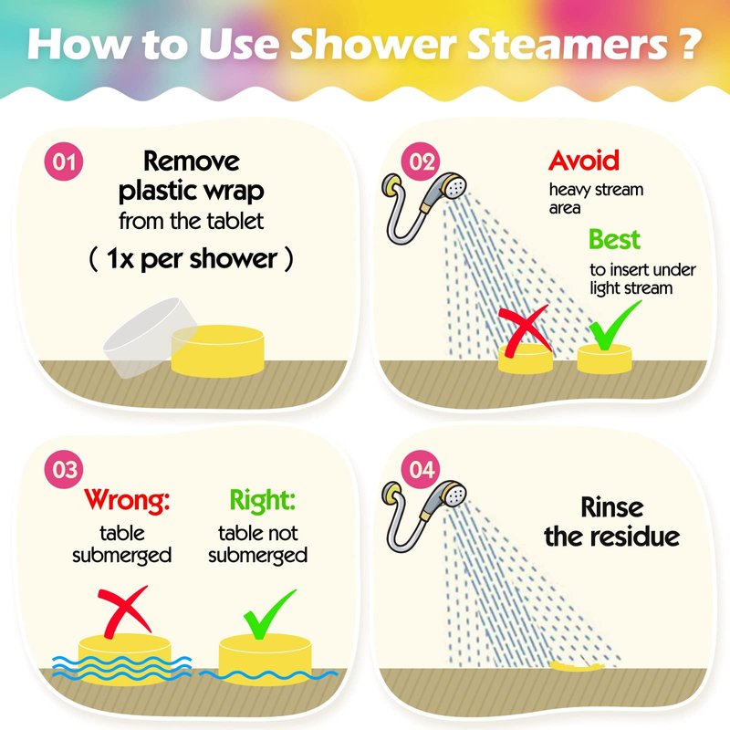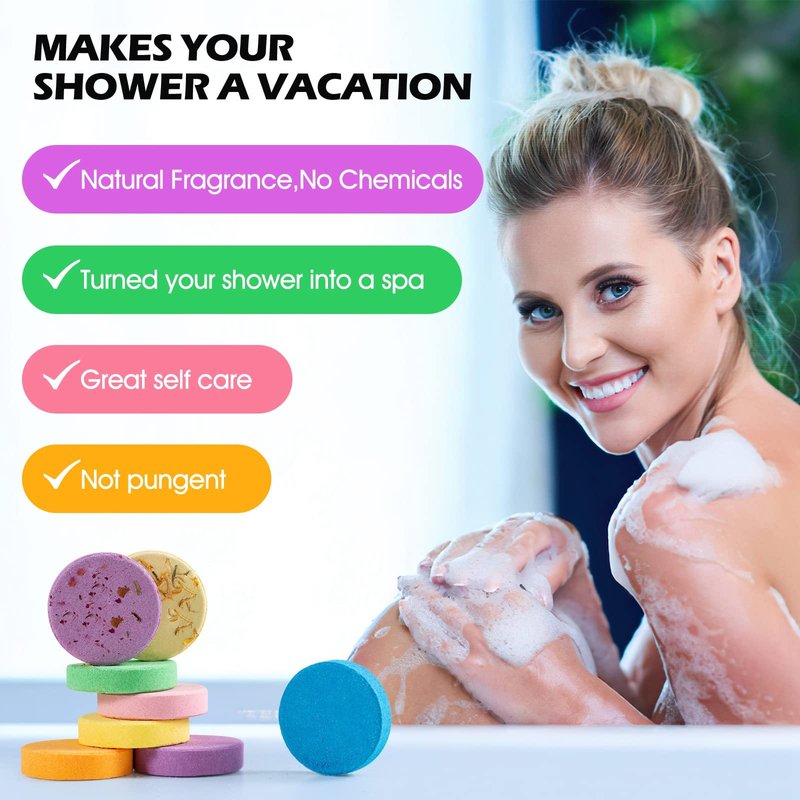 - 【A Deluxe Home Spa Experience】Simply remove the plastic seal, place one of the aromatherapy shower tablets in the corner of your shower and let the steam work its magic; Our shower bombs gradually release their aroma and envelop your whole body with an enchanting scent. It turns your shower into a SPA, nice way to pamper yourself.