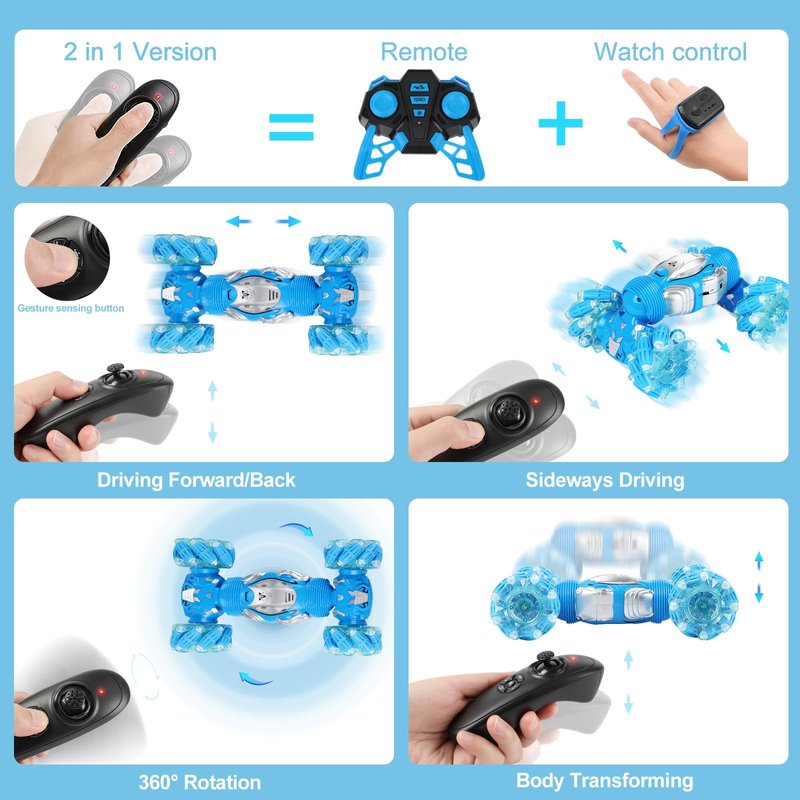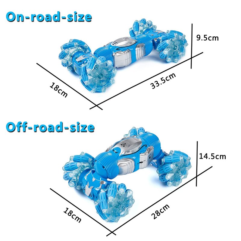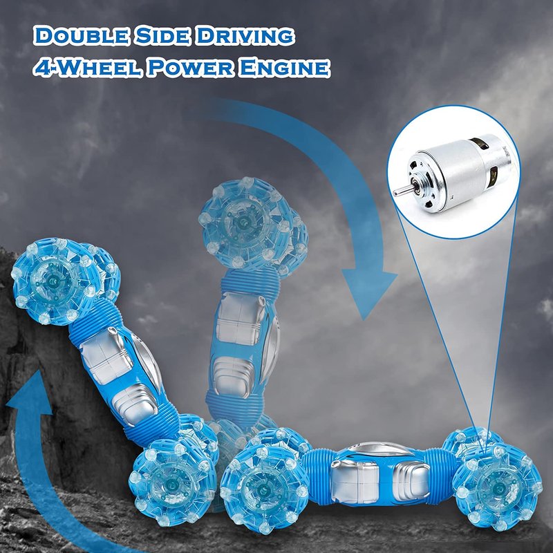 - 【2-In-1 Gravity Sensor Remote Control】:One-click switch between manual remote control and hand gesture gravity sensor control. Redefines a new gameplay of RC crawler. 2.4GHz control system can realize remote precise control. It can not only perform 360°tumbling rotation and double-sided tumbling, but also drive sideways and drift in all directions.