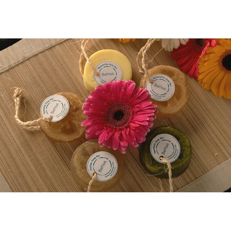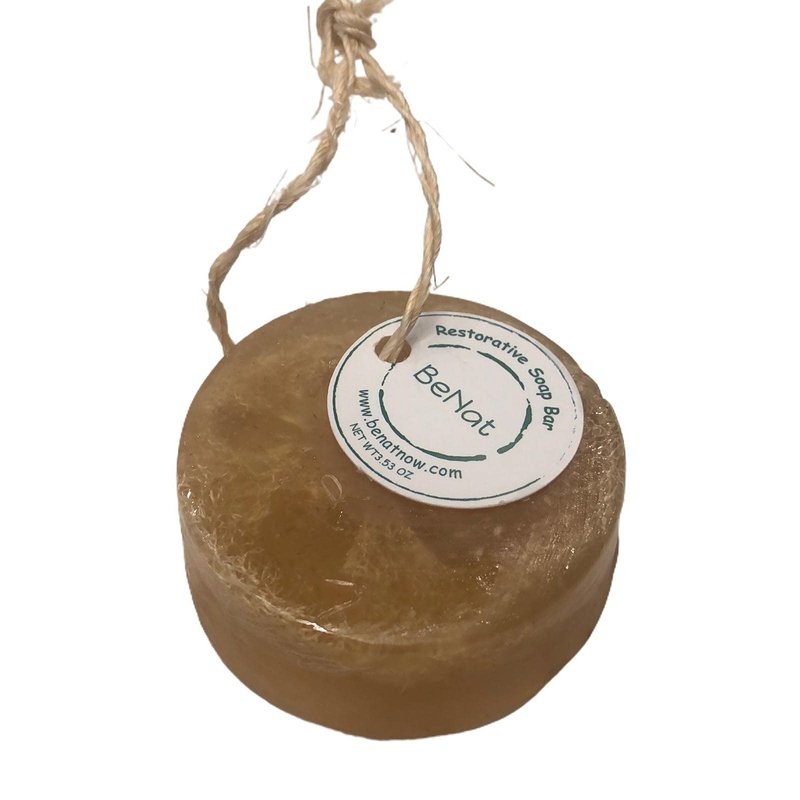 BeNat's Restorative soap bar is the best way to cleanse and soothe your body. Enriched with natural ingredients like oat, olive, and coconut oil. This Soap Bar cleanses, exfoliates, and moisturizes naturally. The natural loofah helps to exfoliate gently. A natural cleanser that removes dirt and oil that clogs pores and exfoliates the skin.