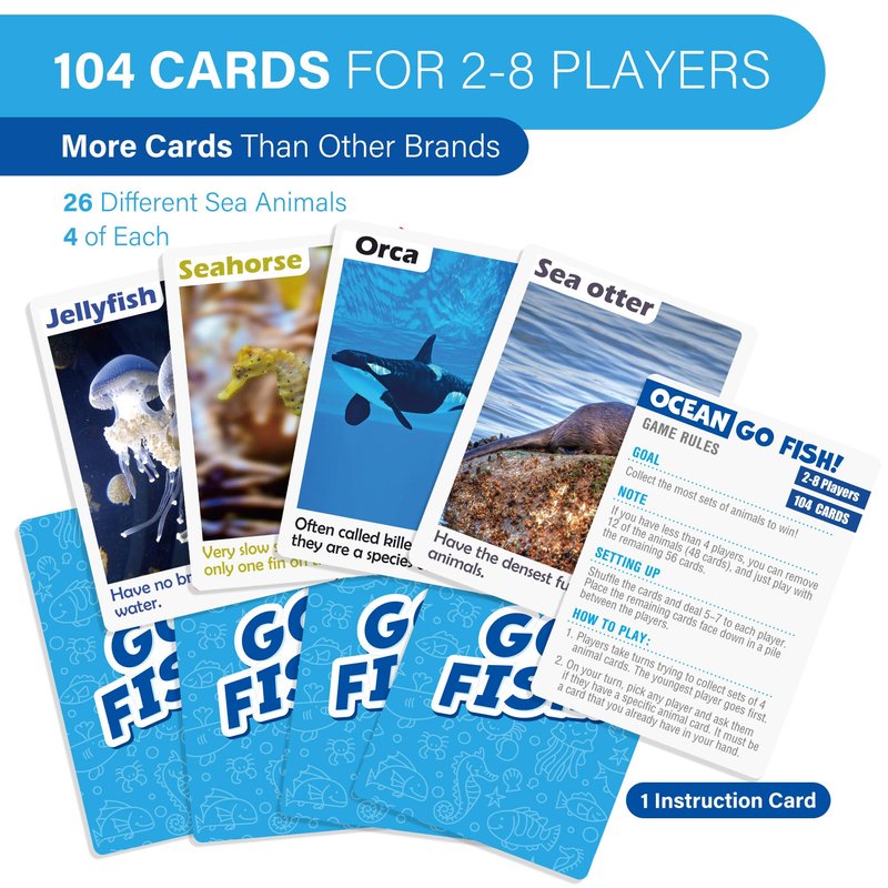 BenBen Go Fish Card Game for Kids, 104 Cards, Ocean Theme Memory Matching Game, Sea Animals Learning Playing Cards, Picture Cards with Real Photos, Fun Facts, 2-8 Players