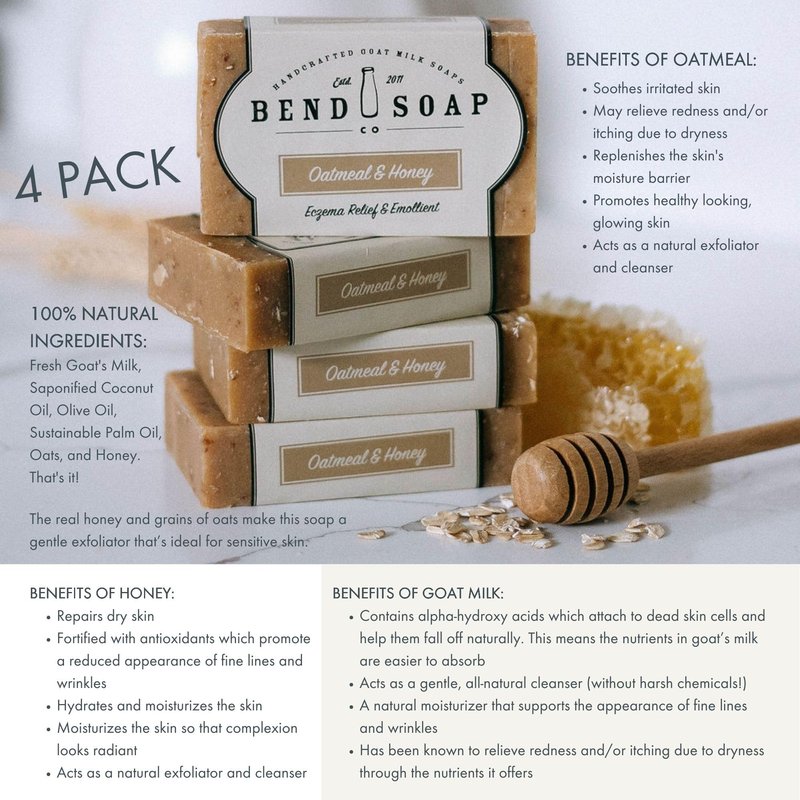Bend Soap Company All Natural Handmade Goat Milk Soap for Dry Skin Relief, Oatmeal & Honey, 4.5 oz 4 pack