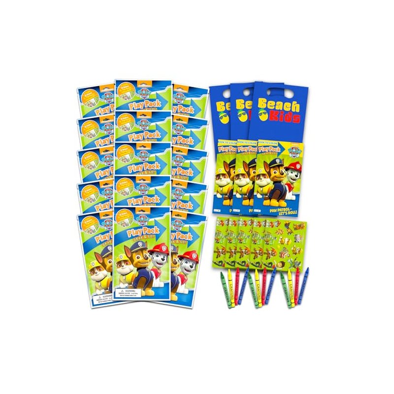 Set of 15 Paw Patrol Playpacks. Each Playpack contains 1 childrens mini coloring book, 4 crayons, and 25 stickers. Children’s TV & movie characters for boys & girls. Nick Jr. Paw Patrol art coloring book set features favorite characters like Chase, Marshall, Rubble, Skye, and more. Toddler coloring books Grab and Go fun for car travel & vacations. Fun for holidays, Easter basket, birthdays, and prizes. Cool party favors, supplies, art gifts, and presents. Good grade school toddler coloring book for classroom rewards and giveaways making it the best coloring book set. Kids coloring books activities for daycare, camp, parties, pre-school, kindergarten, birthday parties, coloring books for kids sleepovers, etc. Fun for boys and girls. Bulk set in resealable bags, ages 3+, especially popular party favors for kids under 5. Officially licensed Nickelodeon Paw Patrol toys and games products. Comes with bonus blue Beach Kids loot bags!