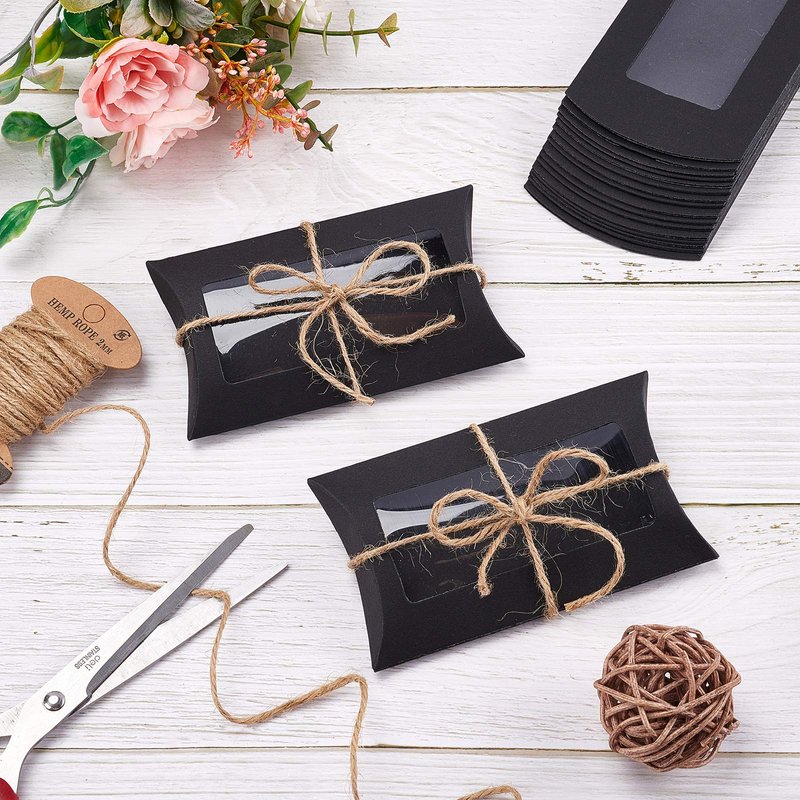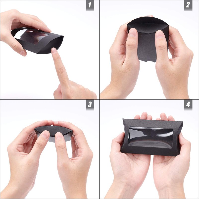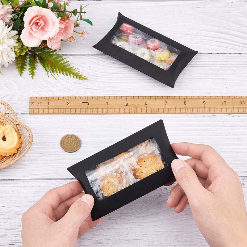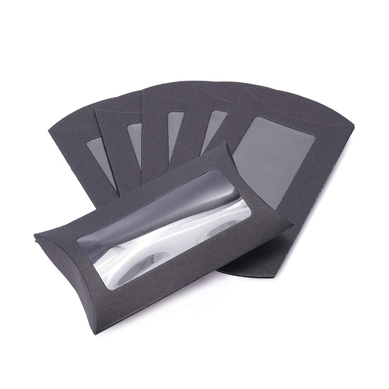 BENECREAT Kraft Paper Pillow Boxes with Clear Window Specification Quantity: 30pcs Color: black Folded Size: 5x3x1.5 Inches Features Ship in flat, easy to fold Clear window show gifts or treats better Ideal for candy treat packaging, birthday wedding parties, graduation party, etc!