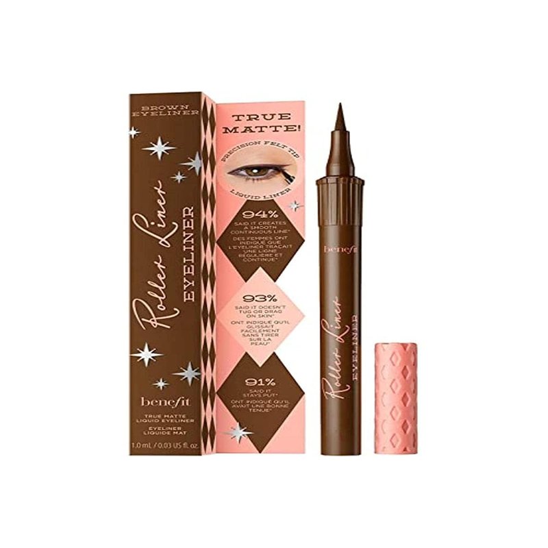 Benefit Cosmetics Roller Liner Matte Liquid Eyeliner in Brown - 0.03 FL OZ. This matte liquid liner features an easy-glide precision felt tip for sharp, controlled lines and a super-smooth application that won't drag. The quick-dry, waterproof formula lasts all day and dries to a natural matte finish without flaking, fading, bleeding, or smudging, so you can let the good times roll all day and all night.