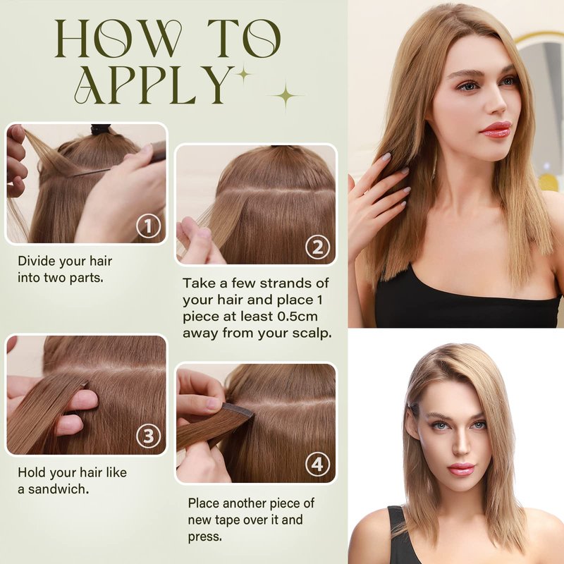 - 💖Premium Quality Invisible Tape Ins💖--Our double-sided, invisible and re-usable tape is of the highest quality, making it easy to install or remove the tape in extensions. Each package also contains 10pcs extra tapes so you can replace them when required. It is recommended to adjust the tape every 4 weeks to keep the hair looking great. The tape can be made more adhesive by heating.