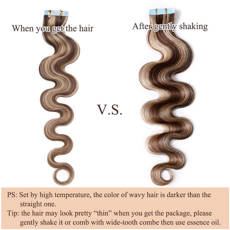 - 💖About Color Difference💖--The color of wavy tape in hair extensions human hair is darker than the straight because of the processing technology. Due to the photograph lights and different computer resolution, there will be a bit off color, please feel free to contact us if u have any problem about the colors.