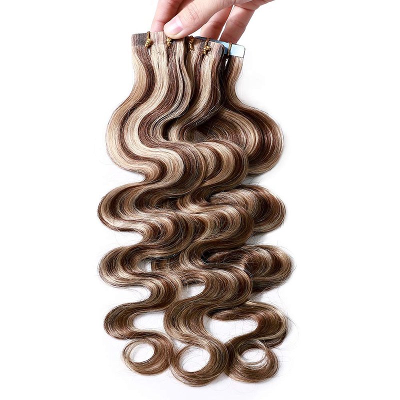 Benehair Remy Tape in Hair Extensions Human Hair Medium Brown&Dark Blonde Seamless Skin Weft Tape in Real Human Hair Extensions Wavy Hair 16 Inch 50g #4P27 20 pcs