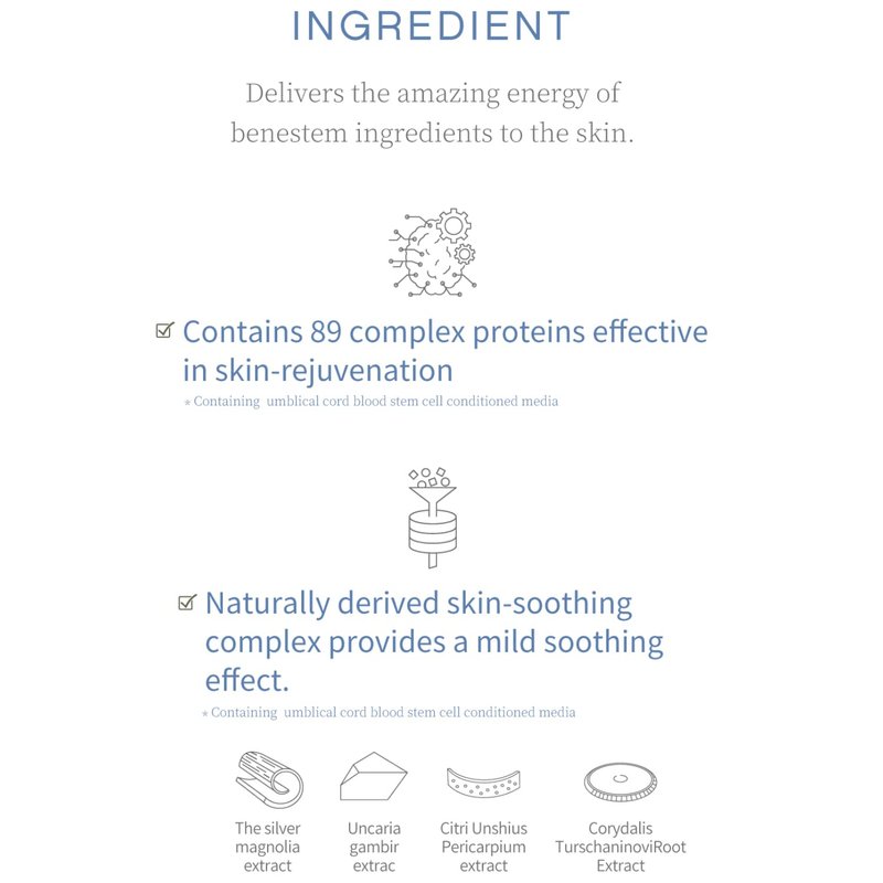 - INGREDIENT * Delivers the amazing energy of benestem ingredients to the skin. Contains 89 complex proteins effective in skin-rejuvenation. * Naturally derived skin-soothing complex provides a mild soothing effect. * Containing umblical cord blood stem cell conditioned media.