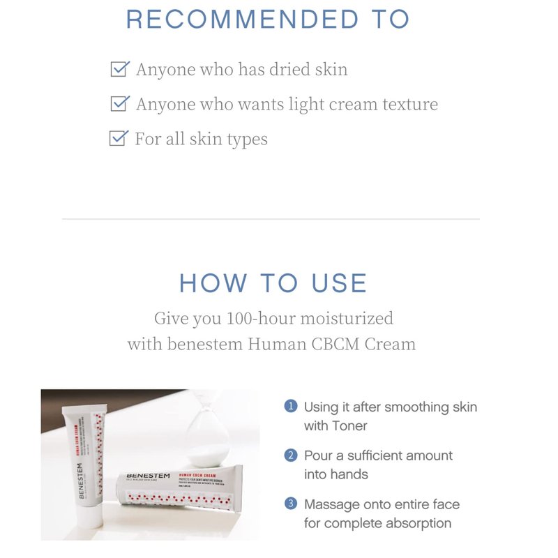 - HOW TO USE * Give you 100-hour moisturized with benestem Human CBCM Cream 1. Using it after smoothing skin with Toner 2. Pour a sufficient amount into hands 3. Massage onto entire face for complete absorption