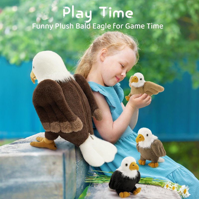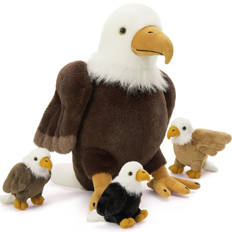 - PLAYFUL BALD EAGLE SET: Includes 1 mother eagle stuffed animal, and 3 small plush eagles, total 4 pieces, has a great combination for play and decoration. Pillow-soft simulated feathers are so soft you can't help but pet them