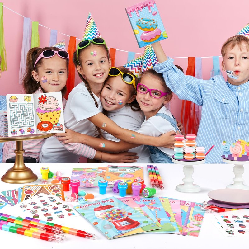 - Package Include: you will get 24 doughnut mini coloring book, 24 stacking crayons, 24 candy stampers, 24 sweet treats stickers, 24 make-a-face stickers, 24 artificial simulation macaron lollipop, 24 clear gift bags.A complete candyland school stationery favor set for your use.