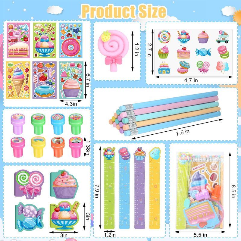 - Package Include: you will get 12 doughnut mini notebooks, 12 dessert pencils, 12 candyland rulers, 12 candy stampers, 12 sweet treats stickers, 12 make-a-face stickers, 12 macaron lollipop toys, 12 clear gift bags. A complete candyland school stationery favor set for your use.