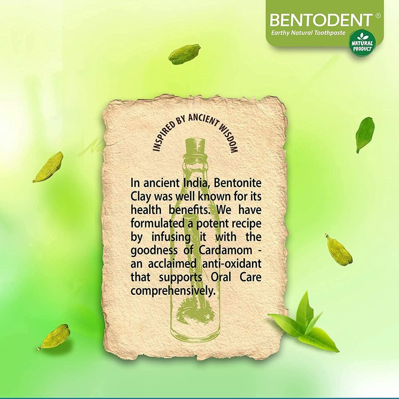 🌿 Bentodent Calcium Bentonite Clay Toothpaste with Cardamom - Embrace Nature's Purity 🌿 Discover the Fusion of Tradition and Innovation: 🌿 World's First Fusion: Bentodent proudly introduces the world's first toothpaste combining the natural detoxifying properties of calcium bentonite clay with the aromatic power of cardamom. A pioneering blend designed for the discerning individual seeking both efficacy and an unparalleled natural experience.