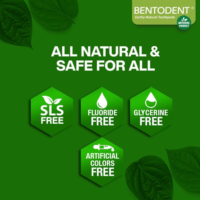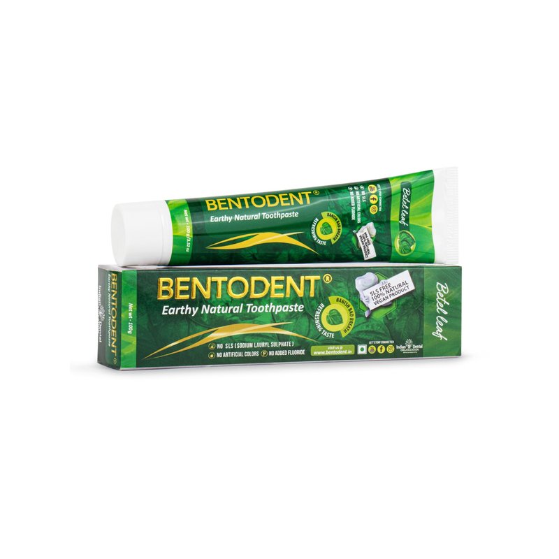 WORLD'S FIRST TOOTHPASTE POWERED WITH GOODNESS OF BETEL LEAF | Bentodent Natural Toothpaste | When Ayurveda meets Modern Science | Powered by goodness of exotic herbs | Bentodent Earthly Natural Toothpaste is Fluoride free, No SLS, No artificial colors, Organic, Herbal & Vegan. Good for all ages including kids as does not contain fluoride. Why natural toothpaste Bentodent? Bentodent, the earthly natural toothpaste is free of Sodium Lauryl Sulphate. Natural ingredient Bentonite clay gives equal cleansing efficiency without deteriorating effect on gum and teeth. It has teeth whitening effect in long-term too. The goodness of most likeable Betel leaf to freshen breath and support oral health NATURAL & SAFE INGREDIENTS: - Purified Aqua, Bentonite Earth, Salt, Menthol, Natural Glycolipids, Purified Stevia extract, Betel Leaf Essential oil, Tea tree Oil, Orange Extract, Grapefruit seed extract