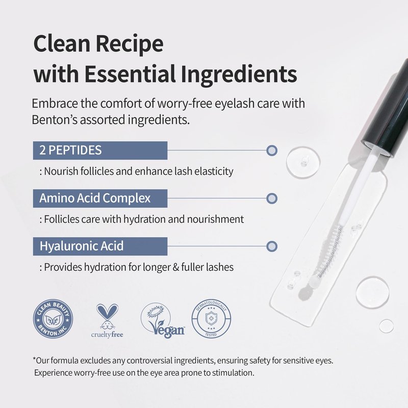 - [BENTON's Assorted Ingredients] Infused with two types of peptides, 17 amino acids, and hyaluronic acid, this serum nourishes and moisturizes lashes and roots, promoting healthy growth.