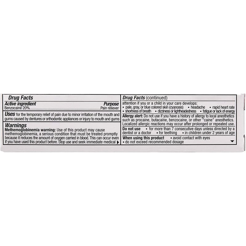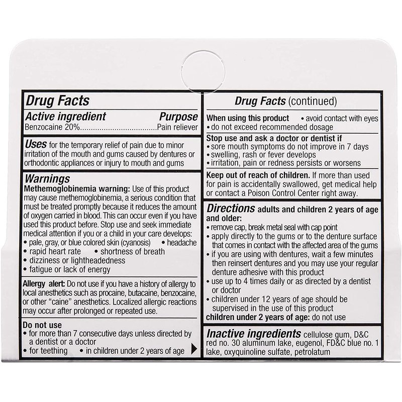 Benzodent provides temporary relief of pain for oral discomfort caused by dentures, braces or canker sores. With the maximum amount of benzocaine allowed in an OTC oral care product, Benzodent is the dentist-preferred anesthetic for oral pain associated with new or ill-fitting dentures. The unique formula cushions and adheres to gums for pain relief that lasts for hours.