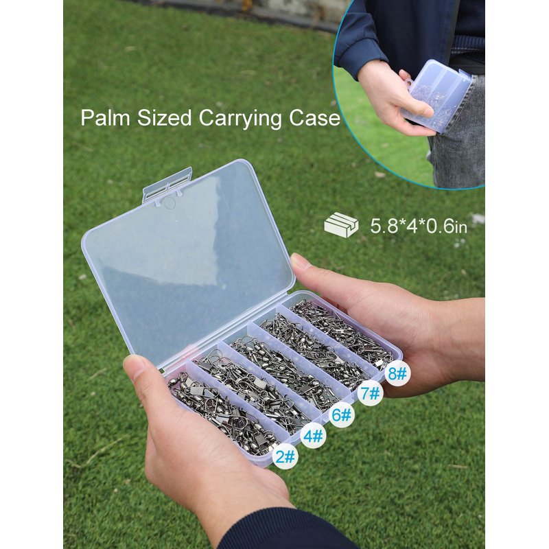 - Portable to Carry: Excellent selection of snap swivels organized in divided plastic box. Palm sized carrying case (5.8x4x0.6inch) enough to fit in bottom of tackle box or pocket.